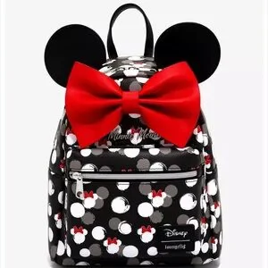 This charming Disney backpack showcases a delightful Minnie Mouse theme with a large red bow and iconic Mickey Mouse ears. The black and red color scheme is accentuated by playful polka dots and heart motifs, making it a standout accessory for any Disney fan.