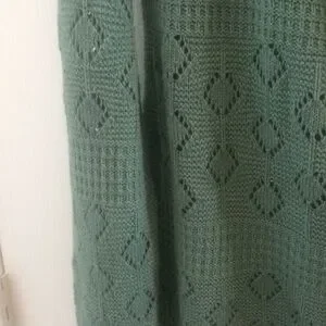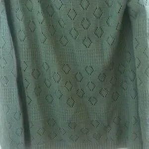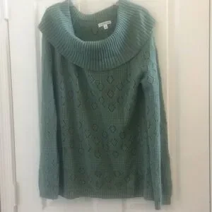 Elegant green sweater with a wide ribbed collar. Features a diamond knit pattern. Perfect for cozy wear.