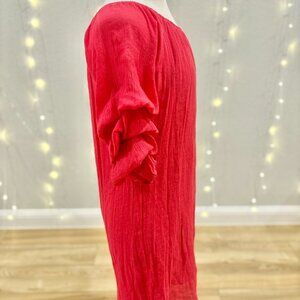 Boho Peasant Dress Pink Crinkle Gauze Ruffle Sleeve Midi Cover-Up