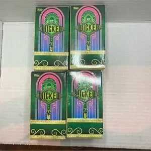 Set of four Funko vinyl figures from Wicked. Includes Glinda, Elphaba, Fiyero, and Madame Morrible. Vibrant colors and detailed design.
