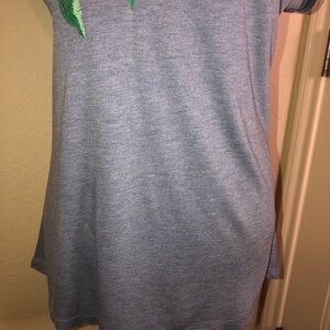Lighter blue background with blue, yellow & green colored floral design embroidered across the front of shirt over the shoulder & the back of shoulder