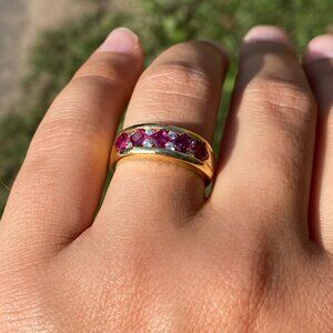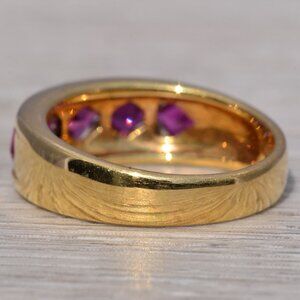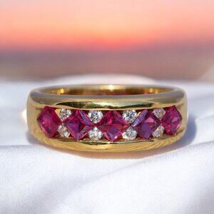 This stunning piece, known as The Radiant Harmony, features a captivating display of natural rubies totaling approximately 0.97 carats. The square princess cut rubies are channel set across the band, alternating with round brilliant cut natural diamonds totaling approximately 0.20 carats. The ring is crafted in 18 karat yellow gold and is currently a finger size 7 .