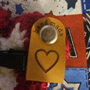 2.5 black metal alligator clip adorned with a 1" brown leather handmade tag with a heart print silver hardware