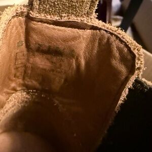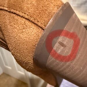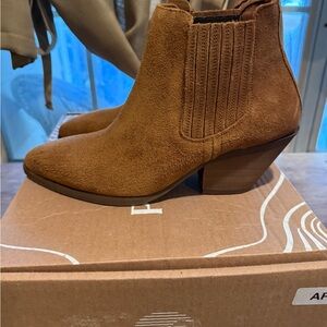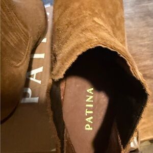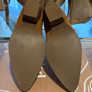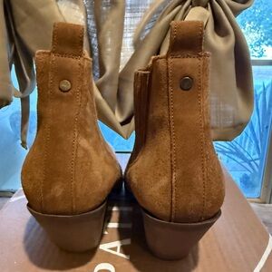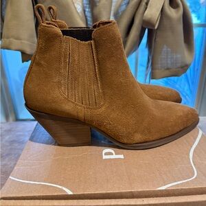 Portland Leather Goods Patina Dakota Western Ankle Boot in the color Sand. (Dakota is part of the style name). BNNW. Stored in box and will ship in box with outer wrapping. Beautiful golden brown suede leather. The sole is "rubberized", so they are comfortable and quiet to wear. Since they are a narrower style boot, they fit true to size (8, 8.5). Great lower heel. There is one imperfection on one of the heels (shown), but is not visible when wearing. The perfect addition to any collection, which is why I have kept them, but they deserve to be worn.