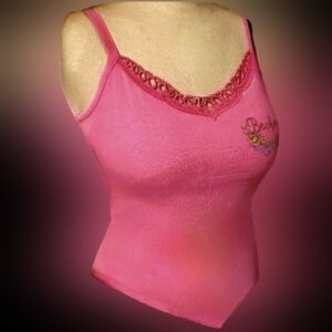 Vtg Y2K pink Broken Spoke saloon embroidered graphic cut out handkerchief tank M