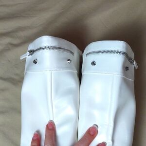 Brand new Shoe Dazzle White Boots in Size 7. These stunning boots are a perfect blend of fashion and functionality. Featuring eye-catching buckles, zippers and studs, they're not just boots, they're a statement piece! With a convenient side zipper for easy on and off, you can effortlessly elevate your style.