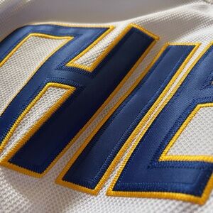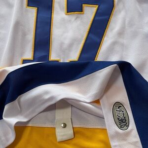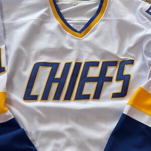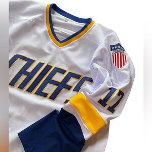 White hockey jersey with blue and yellow accents. Features Charlestown 'Chiefs' logo on the front, #17 Hanson on the back. V Neck with back fight strap. Mad Bros patch.