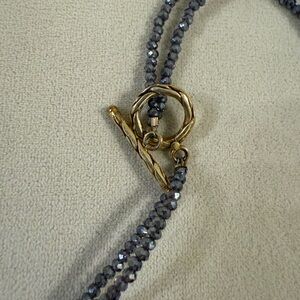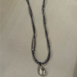 This elegant metallic beaded necklace features a stunning teardrop pendant. Double strand with a sophisticated clasp. Perfect for adding a touch of glamour to any outfit.