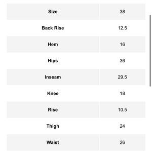 30" inseam; 19" leg opening; 12 1/2" front rise; 16" back rise (size 50IT)