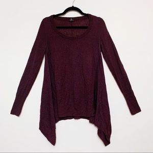 club monaco sweater, alpaca blend sweater, asymmetrical hem top, burgundy long sleeve, minimalist style, soft knit tunic, fall winter basics, cozy chic, draped hem top, womens small