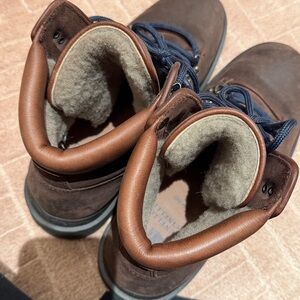 Durable and stylish brown leather hiking boots with sturdy laces. Perfect for outdoor adventures.