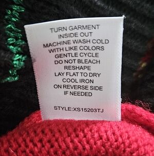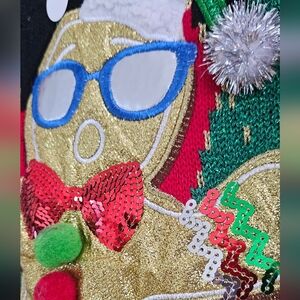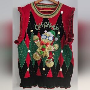 Charming sweater vest featuring a gingerbread design with 'Oh Snap' text. Red, black and green diamond patterns with gold accents. It has some gold sequins detail.