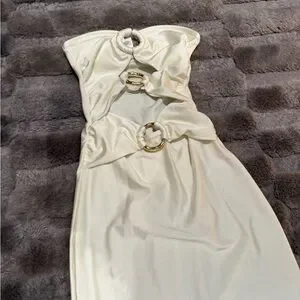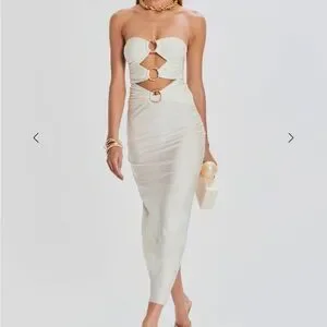 Step out in style with this elegant cream midi dress, featuring chic cut-out details. Perfect for any occasion.