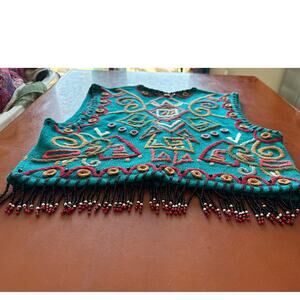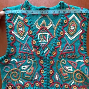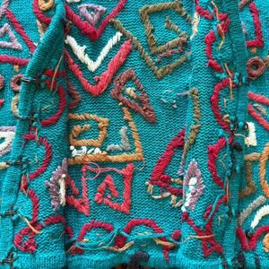 Stand out in this rare vintage knit vest by Rafia, featuring bold embroidered geometric shapes and colorful beaded fringe tassels. A true 1980s–1990s statement piece with artisan flair.