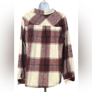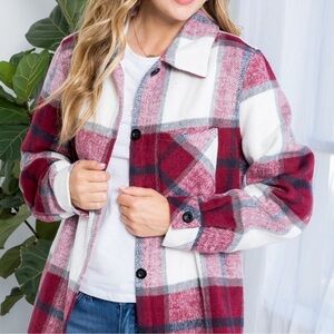 Stay cozy and stylish with this plaid button-up shacket with left chest pocket. Featuring a classic burgundy, black, gray, and cream design, it's perfect for layering in cooler weather. Made with 100% polyester. NWOT Boutique style.
