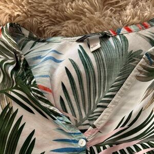 Elevate your wardrobe with this chic button-up blouse featuring a vibrant leafy design. The green and pink hues add a fresh touch to any outfit.