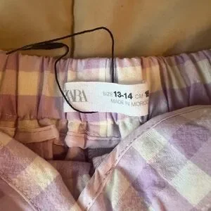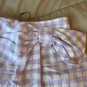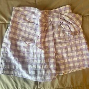 Stylish mini skirt (shorts, with a look of skirt on front) with a lavender checkered pattern. Features a chic bow detail. Perfect for casual outings. New