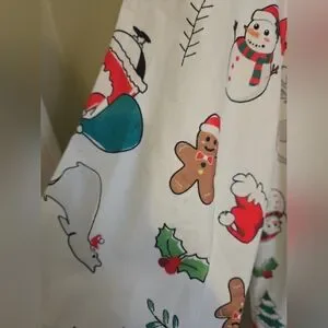 Set of pajamas for men. Fun, all-over print featuring Santa, Gingerbread, Christmas Trees, and Reindeer on a white background with red trim.