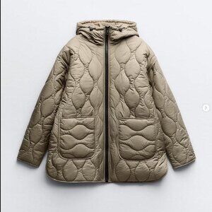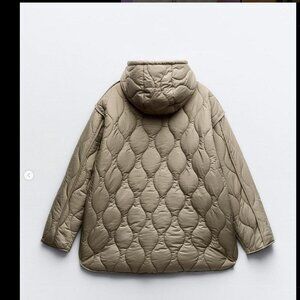 Stay warm and stylish with this Zara quilted puffer jacket in a soft taupe shade. Designed for chilly days, this jacket features a high neck and adjustable hood to protect against the elements. It includes a front zipper closure, two side pockets for convenience, and is filled with a lightweight, insulating material that ensures warmth without bulk. Ideal for layering over winter outfits.