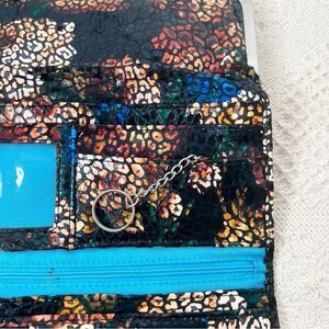 Large Multicolor Leopard Print Leather Rachel Trifold Wallet Kisslock Clutch by Hobo International. Gorgeous colors with metallic details. Classic silhouette with bold maximalist vibes. Hidden magnetic closure for easy opening and secure closure. Exterior framed kisslock pocket. Interior features 8 traditional card slots plus one ID window, three full length bill slip pockets, one zip pocket, and one key chain. Measures 8.25"x4"x1.5". Good condition with a stain to the zipper inside and some loss of the metallic finish in spots to the exterior, you can see it looks matte in some spots in the photos, not obvious at all. Please see all photos.