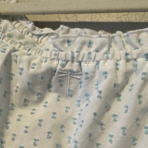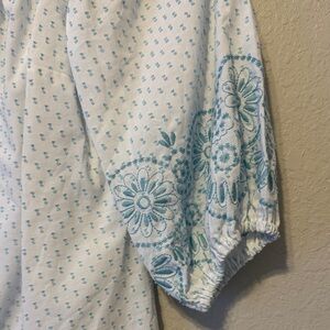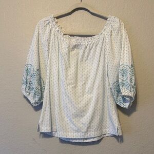 Elegant white top with blue embroidery, perfect for any occasion. Features a comfortable fit and stylish design. Elastic off the shoulder style. Size small. 100% cotton