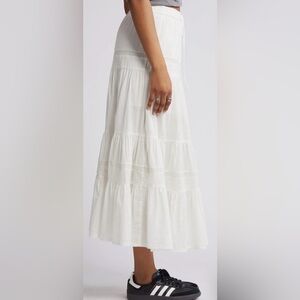 BP by Nordstrom ivory maxi skirt with tiered design. Lace detail. Lining on top. Elastic waist with tie. Lightweight and trendy. 100% cotton. NWT. Size large. Waist measures 18” across & has drawstring. Western, prairiecore, bohemian, cottagecore, breathable, lightweight.