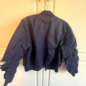 Sleeves and Waist: The jacket has ruched, cuffed sleeves and an elasticated waist.