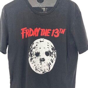Men's black t-shirt featuring the iconic Jason mask graphic and "Friday the 13th" text in red.