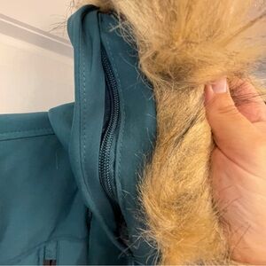 The Canada weather gear women's Teal cinched waist hooded anorak is a stylish and practical winter coat designed for outdoor activities. Made from polyester with a softshell fabric type, this mid-length jacket features a zip and snap closure, long sleeves, and a hood for added warmth. The teal color and logo accents add a touch of style, while the fleece lining and polyester insulation provide comfort and coziness. Perfect for travel or casual wear, this jacket is machine washable for easy care and maintenance. Made in Canada, this jacket embodies a rugged outdoor theme, making it an ideal choice for colder weather. Removable faux fur around hood.