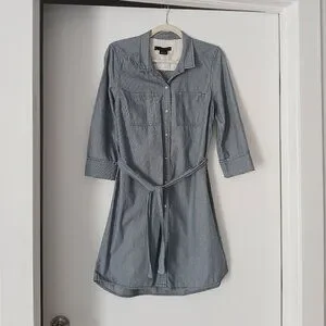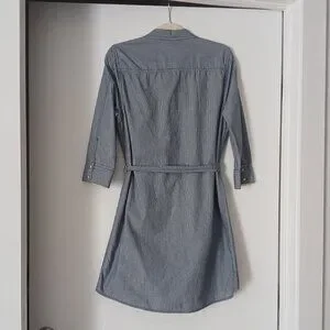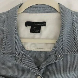 Calvin Klein Button Down Shirt Dress. White and blue thin stripes, long sleeves. Tie belt, long sleeves, collar neckline.