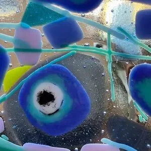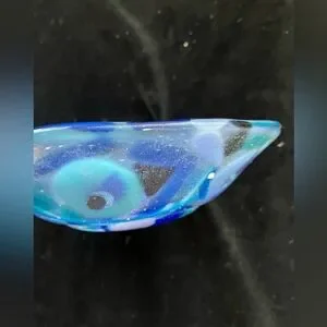 Size is 7”x3”background is translucent blue color Bullseye glass. The original design is Greek style.