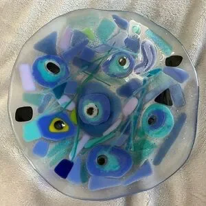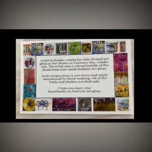 This fused glass art plate is handmade glass. The glass design was made by California artist Victoria Heisler.