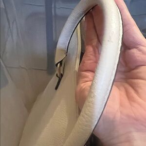 This elegant off white leather handbag is perfect for any occasion. Its sleek design and high-quality material make it a must-have accessory. EUC but some minor call outs. Some rubbing on bottom corners, handle has small scuff scratches, I see small mark on back of bag it should come out with leather cleaner. I tried with a little water but couldn’t get off. See pictures for condition.