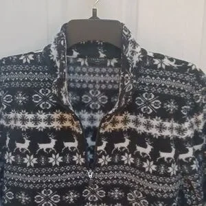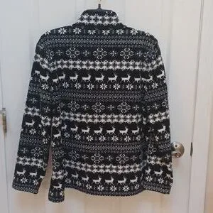 Cozy zip-up fleece with a festive reindeer pattern. Ideal for casual wear. There is no size tag so please go by these approximate measurements pit to pit 23", length 25", sleeve length from shoulder 23". EUC