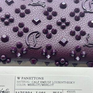 Christian Louboutin grained calfskin leather wallet with tonal Loubintesky empire spikes. Zip-around top with signature red sole pull charm. Interior, two bill and 12 card slots; center zip compartment. Signature red leather and grosgrain lining. 4H x 7.75W x 1D; Color: Atlas. Panettone is made in Italy. Designer color: Merlot (Wine).