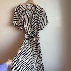 Chic and flowy H&M calf-length dress in a bold zebra print. Made from a soft woven viscose that drapes beautifully. Button-down front with matching tie belt for a flattering waist.