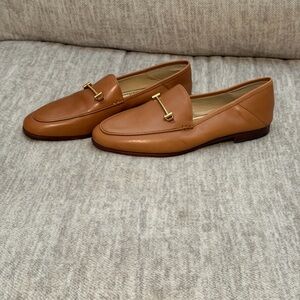 Elegant tan leather loafers with gold accents, perfect for any occasion. New, never worn, only tried on.