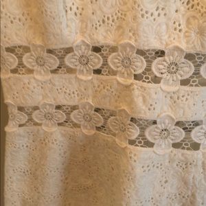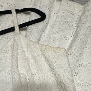 Elegant white dress with eyelet design. Features delicate straps and floral lace detail. Perfect for summer occasions.