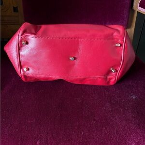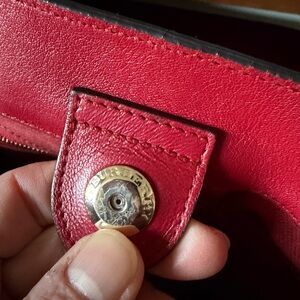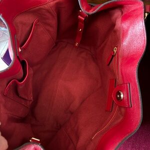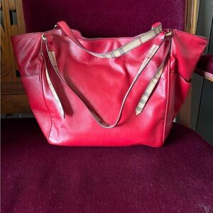 Burberry red leather Canterbury tote bag purse. Red interior. Gold tone hardware. Two outer pockets on side of bag. Size 18” (widest at top) 10” tall 7” wide. 9” strap drop