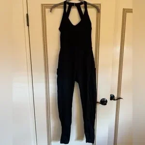 This sleek black jumpsuit offers a stylish and comfortable fit with twist back details. No size tag, but fits like a Medium.