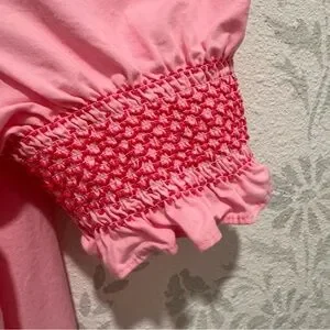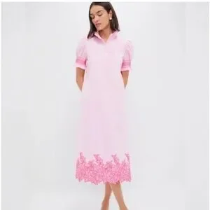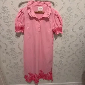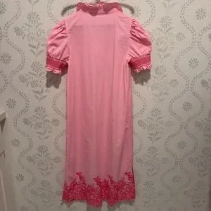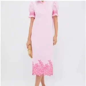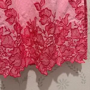 Elegant pink dress featuring a floral hem. Perfect for any occasion.