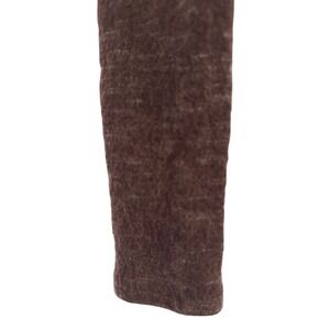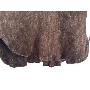 Telluride Clothing Company women's marled brown long sleeve sweater crafted from 100% extrafine merino wool. This top features a crew neckline and a distinctive curved hemline with a subtle ruffle detail.