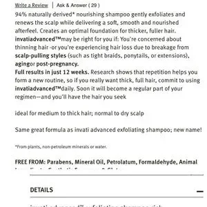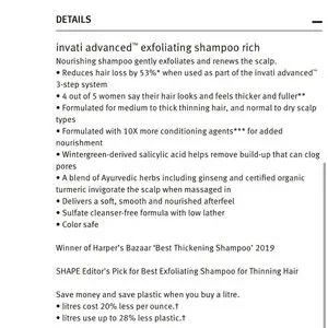 Aveda's Invati Advanced Exfoliating Shampoo Rich formula restores health to the scalp by removing pore-clogging buildup with wintergreen-derived salicylic acid. Especially beneficial for those with thinning hair, breakage, or dry scalp, this sulfate-free formula with low lather contains 10 times more conditioning agents than the brand's Invati Advanced Light exfoliating shampoo.