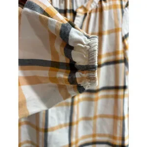 Description: Plaid Yellow Ivory and Navy Peasant Top, C Neck, High/Low, Stretch Wrist, Comfy, Business, Casual, Classic, Cottage, English Country, Preppy