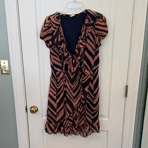 Stylish mini dress with bold rust and navy pattern. Features ruffled details and short sleeves. Perfect for a chic look.