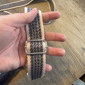 Stylish black crossbody bag featuring a colorful striped strap. Perfect for everyday use.