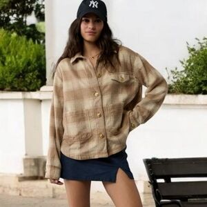 Meet your new go-to layer for spring, vacay, and fall! This AMERICAN EAGLE oversized plaid shacket blends comfort and style with a cool retro-chic vibe. The gold buttons add a touch of vintage style charm, making it perfect for casual days or dressed-up moments.