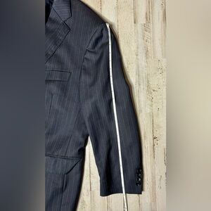 This Brooks Brothers 1818 Regent Blazer is a classic piece for men in size 44S, made from navy blue virgin wool tweed fabric. Featuring a four-button sleeve style, notch lapel, and single-vented design, this blazer exudes quiet luxury with a touch of old money charm. It is suitable for various occasions such as travel, weddings, parties, or formal and business events, making it a versatile addition to any wardrobe. This high-quality blazer is crafted in the United States and offers a timeless style for the modern gentleman.