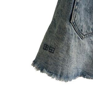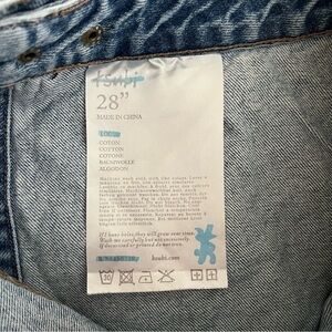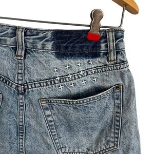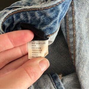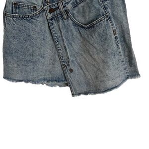 KSUBI Rap Skirt Clas Sick Crossover Mini Skirt. The Rap Skirt is a classic mini skirt constructed from a rigid denim in a blue colourway. This style features an asymmetric front with wrap detail, five pockets, and distressing throughout. Size 28 or US 6 according to size chart.