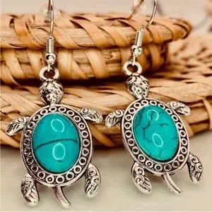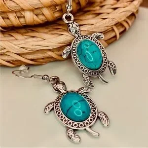 Featuring a beautiful hand work crafted with metal and synthetic turquoise, a cute turtle design french hook wire dangling drop earrings. Perfect for adding a touch of nature-inspired charm to any outfit.